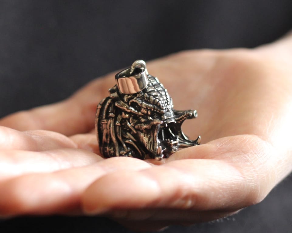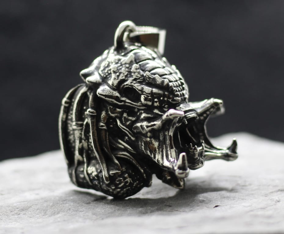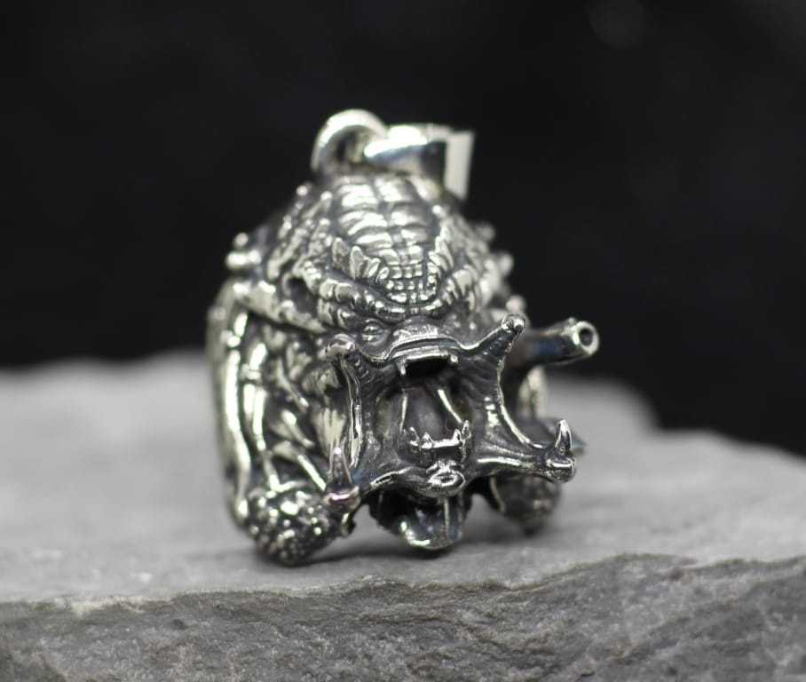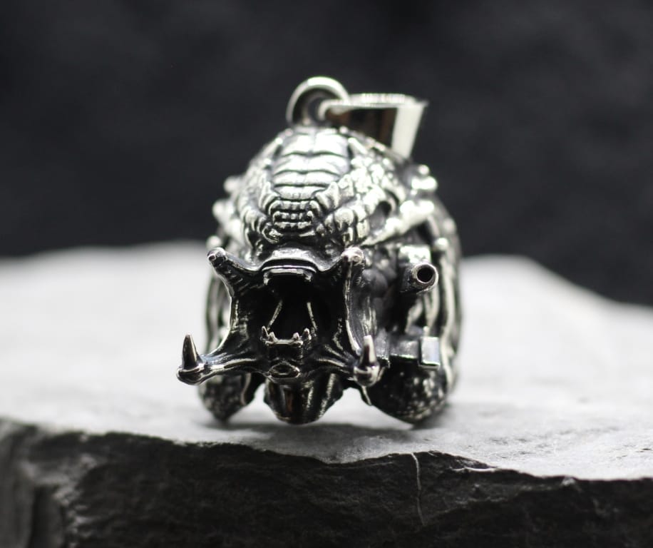 “You’re One Ugly Motherfucker!” pendant. Pendant with the muzzle-face of the Predator and a cannon. Very elaborate and detailed. A pendant for true fans of the Predator Saga. The pendant is large, it occupies almost the entire phalanx, and every detail can be seen in detail.