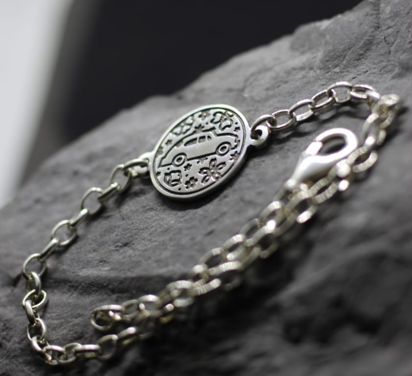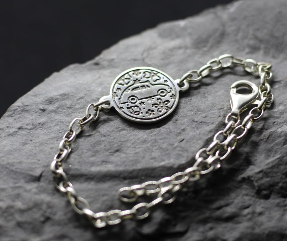 Beetle car flower bracelet. Beetle symbol car. This profile can hardly be mixed up with anything else. For more than half of a century, this seemingly funny machine was produced almost unchanged. As if it did not give a damn about all the laws of the modern appearance of machines, from which streamlining and speed are needed. But it became a symbol of independence of judgments, aesthetics and nostalgia for the European mid-twentieth century. A symbol of slowness and beauty for the sake of aesthetics in mechanical engineering, not just bare utility, which is what modern cars sin. Flowers as a symbol of all of the above give lightness to this image. If a person is romantic inside and inclined towards art without excessive craving for utilitarianism, this is his symbol. It is possible to customize with a decrease or increase size by make to order request.